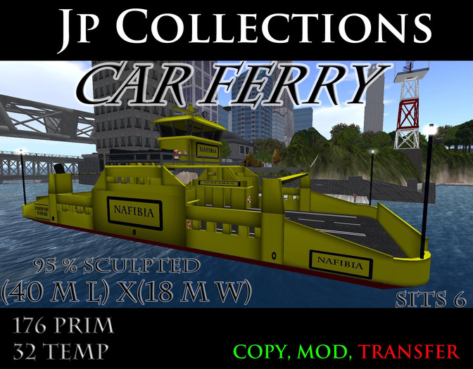Thank You for Your interest in the Jp Collections Car Ferry. This fully Functioning Ferry can hold up to 20 cars; A Fleet of Fire trucks Tanks and Many other Physical or Manned Vehicles around your sim. It is built to specs of areal life carrier and has room for 5 Passengers and a co Pilot. Driving this ferry is simple and docking is even easier With the help of the 3 different camera settings as well as the 4 antennas that allow you to see just exactly where the edges of the boat is so that you can maneuver it into even the tightest Spaces Be sure to check it out In world If you require a Demonstration Contact Josh Piper and he will be more than Happy to assist you .