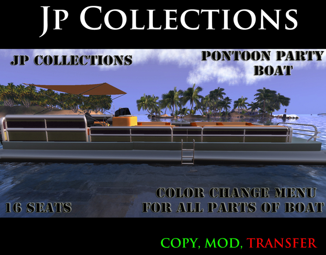 The JP Collections Pontoon Boat is a unique member of the Collections lineup of boats and ships. It contains at least 31 click-able areas that contain color changing scripts that will help you easily change almost every aspect of the boat to your liking. There are hundreds of options and combinations that can easily lead to many unique designs out on the water. The only areas that are not changeable are the hull itself, any metallic pieces, and the captains chair.